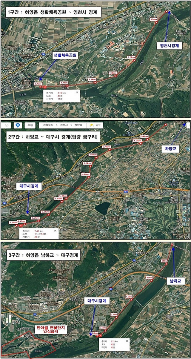 3구간은 하양읍 남하교~대구시 경계(2.8㎞) 구간으로 “영원한 사랑”과 “자기 향상”의 꽃말을 지닌 이팝나무가 5~6월에 흰 꽃을 피우고 거리에는 달콤한 향기가 나도록 조성되어 있다. 그리고, 경산시 명품 가로수길과 맞닿은 대구시 반야월에는 연밭(꽃)과 데크 산책로로 잘 조성된 연꽃단지가 있어 함께 구경하는 재미도 있을 것으로 보인다.