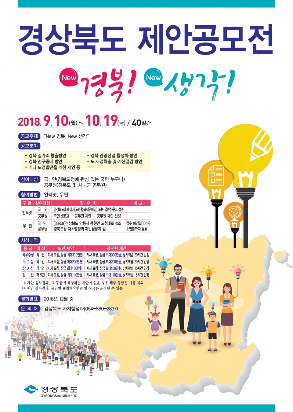 경상북도는 10일(월)부터 내달 19일까지 40일간 국민 및 공무원의 창의적인 아이디어를 발굴해 새로운 정책개발과 소통하는 도정을 구현하기 위해 ‘New 경북! New 생각!’제안공모전을 실시한다고 밝혔다.