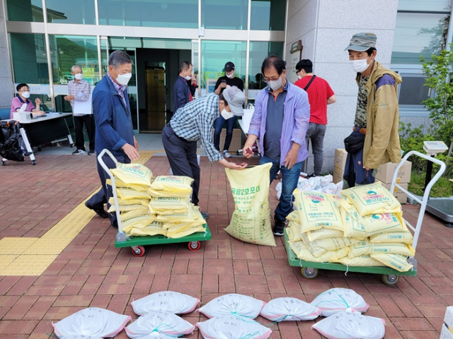 | ↑↑ 팥 재배농가들이 수매계약을 체결한 후 팥 종자를 수령하고 있다 |