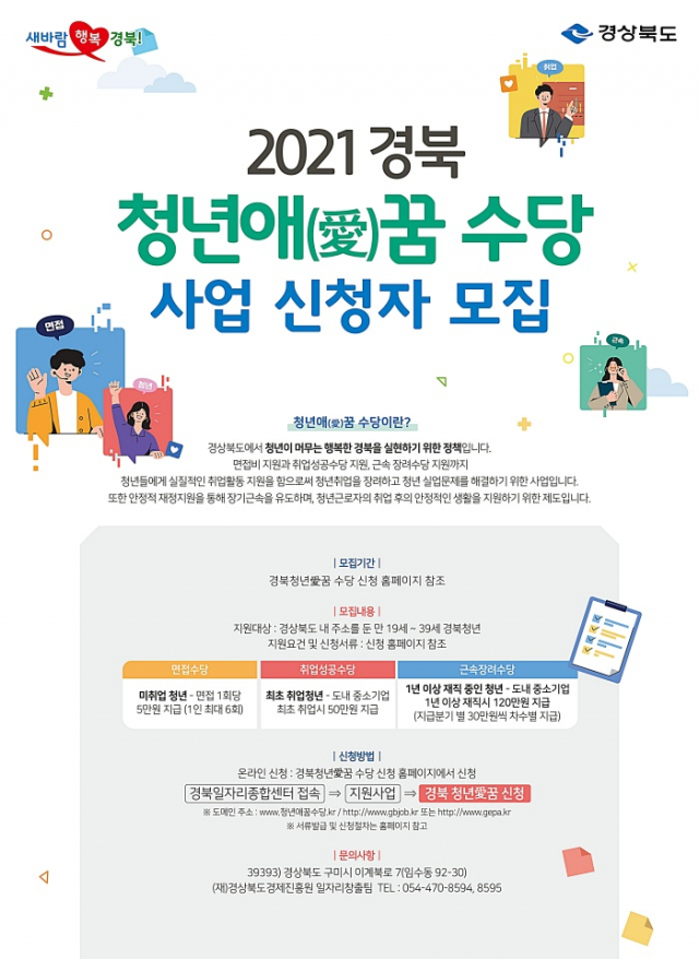 경북도는 6월부터 적극적으로 구직․근로 활동하는 청년들을 위한 지원정책인 ‘청년애(愛)꿈 수당’을 본격적으로 시행한다.