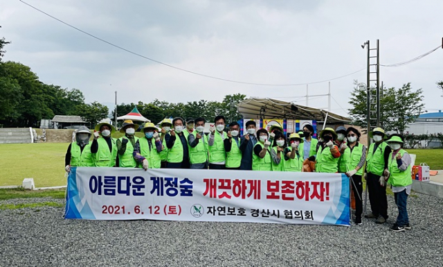 자연보호 경산시협의회(회장 석부홍) 회원 및 자연보호 자인면협의회(회장 이정훈) 회원 40여명이 12일 자인단오제 행사를 대비하여 계정숲 일원에서 쓰레기 줍기 등 환경정화활동을 실시하였다.
