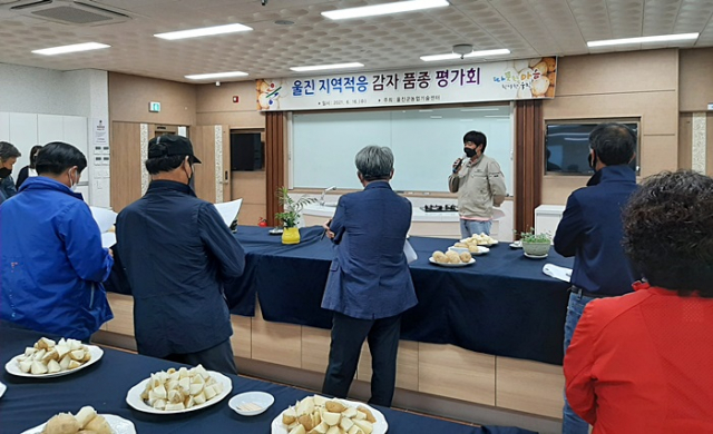 울진군(군수 전찬걸)은 지난 6월 16일 농업기술센터에서 울진군 감자작목반 회원 등 40여명이 참석한 가운데 울진지역에 적합한 경쟁력있는 신품종 감자 품종 선발을 위한 평가회를 개최하였다.