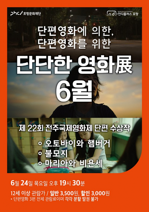 포항문화재단 ‘인디플러스 포항’에서 오는 6월 24일(목) 오후 7시 30분 단단한영화展 ‘제22회 전주국제영화제 단편 수상작’을 상영한다. 이번 단편전 에서는 △오토바이와 햄버거 △불모지 △마리아와 비욘세 등 2021년 전주국제영화제 한국단편경쟁 부문 수상작들을 만나볼 수 있다.