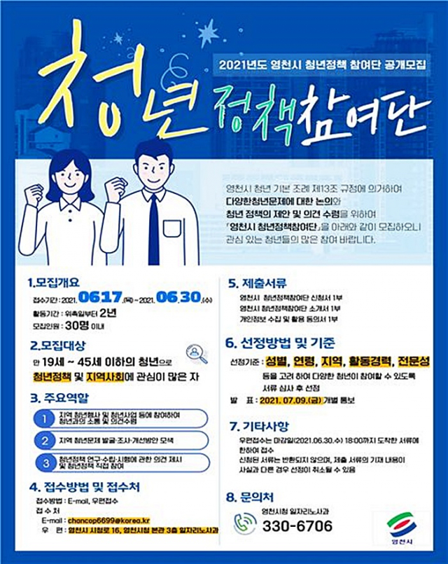 영천시(시장 최기문)는 올해 1기 ‘청년정책참여단’ 참여자를 공개모집한다.