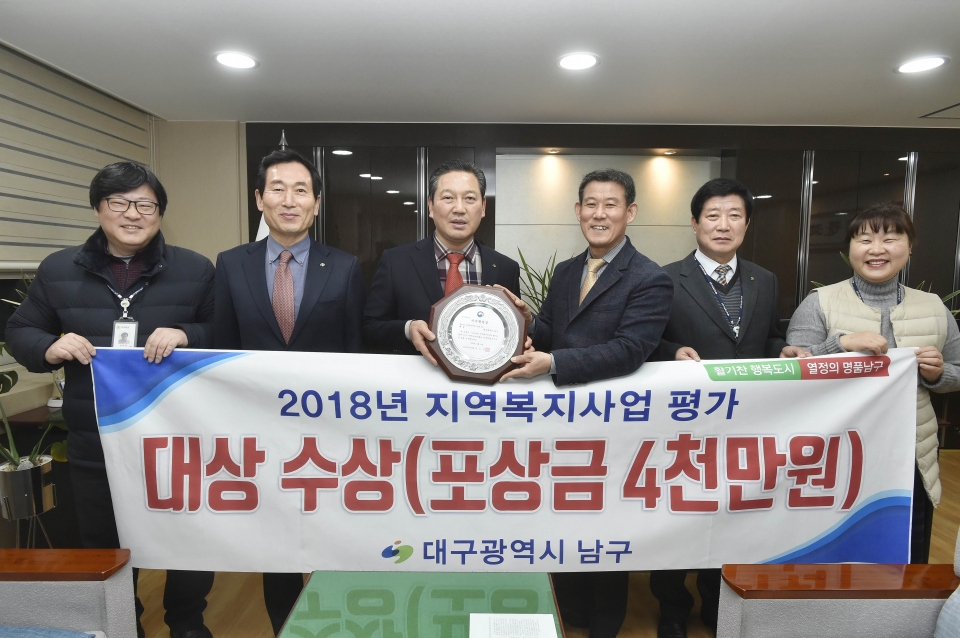 대구 남구청(구청장 조재구)은 지난 10일 정부세종컨벤션센터에서 개최된 '2018년 복지행정상' 지역복지사업 평가에서 ‘찾아가는 보건복지서비스 제공’ 분야 대상 수상기관으로 선정되었다고 밝혔다.