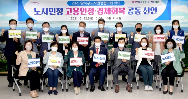 대구 달서구(구청장 이태훈)는 지난 22일 달서구청 회의실에서 달서구노사 민정협의회 위원 18명이 참석한 가운데 노사간 고용안정과 지역경제 발전 협의를 위한 달서구노사민정협의회 회의를 개최했다고 밝혔다.