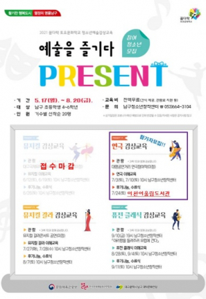 대구광역시 남구청(구청장 조재구)은 지난 16일, 2021 꿈다락 토요문화학교 「PRESENT-예술을 즐기다」를 개강했다고 밝혔다.