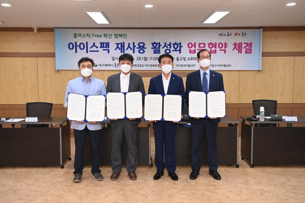 대구 동구청(구청장 배기철)이 지난 28일 한국환경공단 대구경북환경본부(본부장 진병복), 대구광역자활센터(센터장 박송묵), 대구동구지역자활센터(센터장 김수동)와 ‘플라스틱 Free 확산 캠페인’ 업무 협약(MOU)을 체결하고, 아이스팩 적정처리 및 재사용 활성화를 도모하기로 했다.