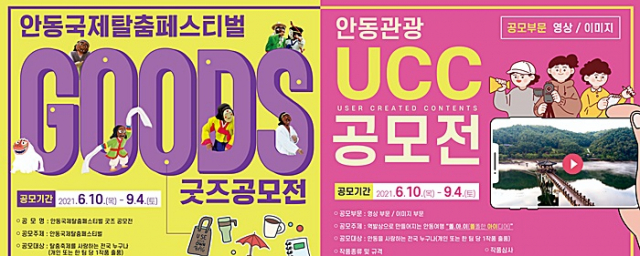 「안동국제탈춤페스티벌 굿즈 공모전」은 안동국제탈춤페스티벌과 연계하여 창의적이고 실용적인 굿즈를 발굴·제작하기 위한 공모전이며, 「안동관광 UCC 공모전」은 안동을 효과적으로 홍보할 수 있는 영상과 이미지를 제작하기 위한 공모전으로, 오는 9월 4일(토)까지 접수한다.