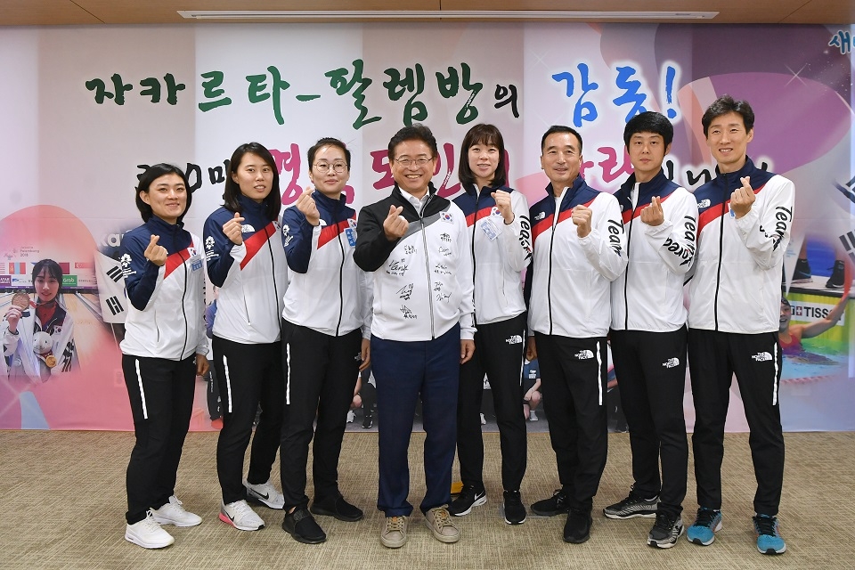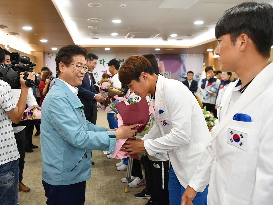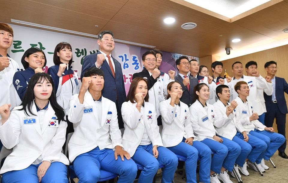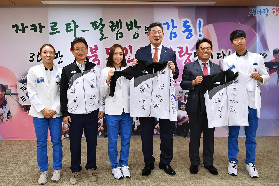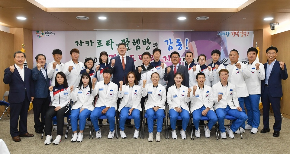 경상북도는 6일(목) 도청 회의실에서 ‘2018 자카르타-팔렘방 아시안게임’에서 불굴의 도전과 투혼으로 대활약을 펼쳐 국민들에게 감동을 주고 개선한 경북도 소속 메달리스트들을 축하하고 격려하는 환영식을 가졌다.