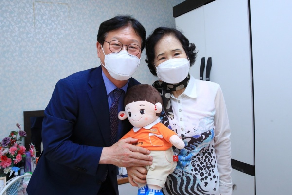 김대권 대구 수성구청장은 30일 범어동에 거주하는 홀몸어르신 가구 2곳을 방문해 효도인형 효돌이를 전달하고, 음성메시지를 주고받으면서 효도 인형을 시연하는 시간을 가졌다.