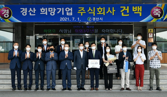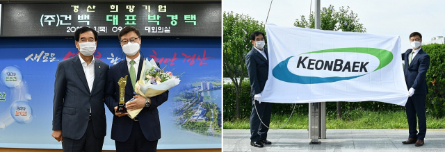 경산시(시장 최영조)는 탄탄한 기업경영으로 지속적인 성장과 발전을 거듭해 지역경제 활성화와 일자리 창출에 크게 기여한 (주)건백을 2021년 3분기 경산 희망기업으로 선정하고, 1일 시청 국기게양대 앞에서 회사기 게양 및 현판 전달식을 가졌다.