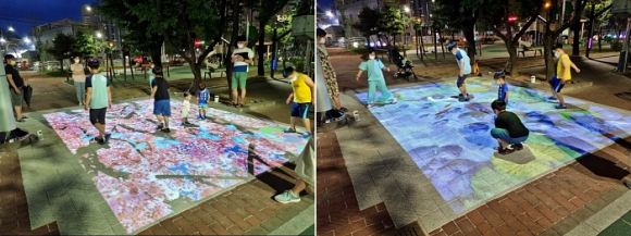 경산시 공원녹지과에서는 백천공원을 방문하는 시민들의 움직임에 따라, 바닥을 비추는 영상이 유기적으로 반응하여 움직이는 인터렉티브(상호작용) 영상조명을 설치완료 하였다고 1일 밝혔다.