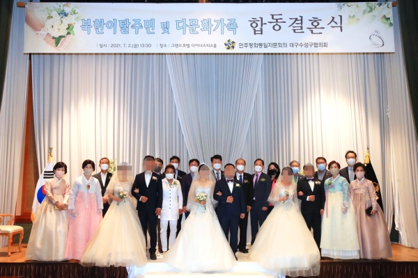 민주평화통일자문회의 대구수성구협의회(회장 신철범)는 2일 대구 그랜드호텔 다이너스티A홀에서 경제적 어려움으로 결혼식을 올리지 못한 북한이탈주민과 다문화가정 부부 3쌍을 위해 합동결혼식을 열었다.