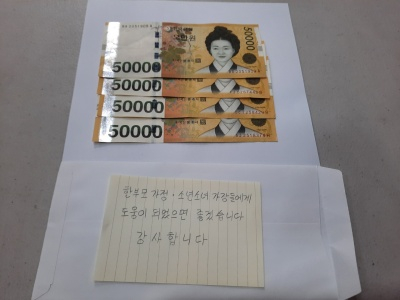 봉투에는 ‘한부모 가정·소년소녀 가장들에게 도움이 되었으면 좋겠습니다. 감사합니다’ 라는 편지와 함께 5만 원권 4장이 들어 있었다.