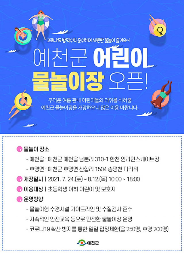 예천군(군수 김학동)이 이달 24일부터 8월 12일까지 20일간 예천읍 한천 체육공원과 호명면 도청 신도시 경북도서관 옆 도로 부지에 어린이 물놀이장을 운영한다.