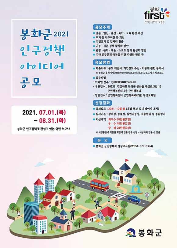 봉화군(군수 엄태항)은 저출산 고령화, 인구 유출 등 지역 인구문제에 대응하기 위해 7월 1일부터 8월 31일까지 인구정책 아이디어를 공모한다.