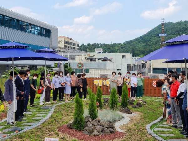 | ↑↑ 범물1동 행정복지센터는 지난 6월 29일 리모델링한 건물 옥상의 하늘정원에서 김대권 수성구청장을 비롯해 조용성 수성구의회의장, 김태원 시의원, 범물1동 지역주민들이 참석한 가운데 개소식을 가졌다. |