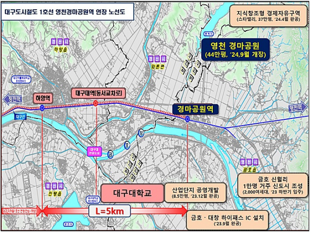 대구도시철도1호선 영천경마공원(금호) 연장은 총 사업비 2,052억원 정도가 예상되며 경산시 하양역에서 영천시 금호읍까지 약 5㎞ 도시철도를 연장하는 사업이다.