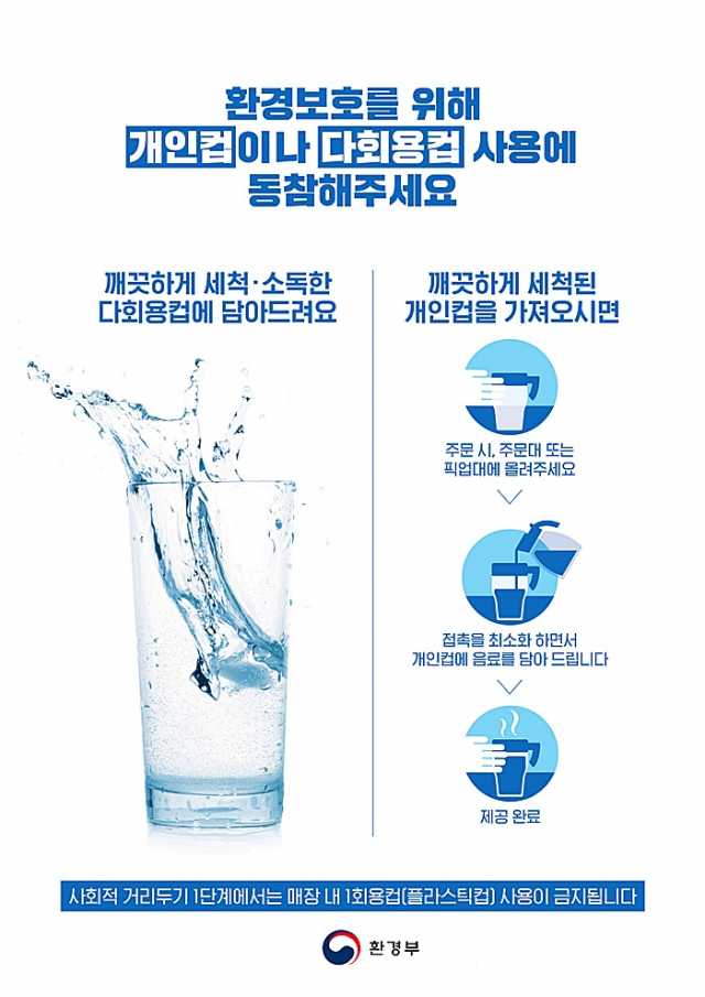 개편된 사회적 거리두기 1단계에서는 1회용품 사용규제로서 업소에서는 충분히 세척·소독한 다회용 컵을 사용하여야 하며, 이용자가 깨끗하게 세척된 개인컵을 사용할 시에는 접촉을 최소화하면서 서비스를 제공하여야 한다.