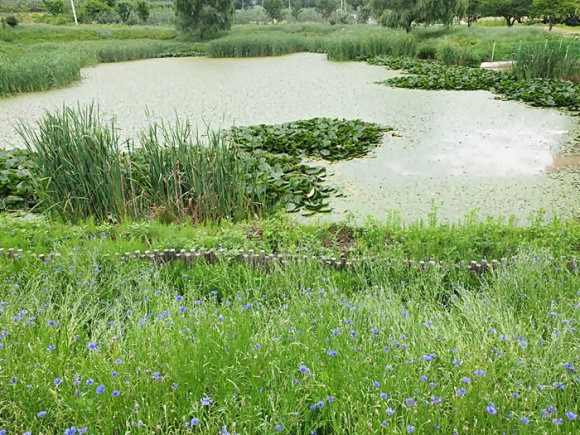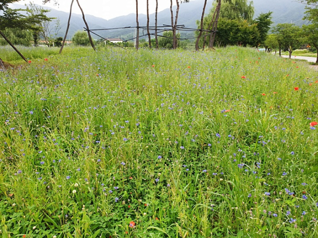 경북 영주시 콩세계과학관의 연못 주변에 수레국화를 비롯한 꽃양귀비 등이 만개해 아름다운 장관을 연출하고 있다고 지난 7월 5일 밝혔다.