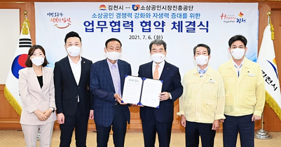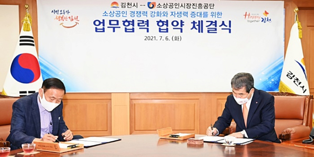 김천시(시장 김충섭)는 7월 6일 김천시청에서 김천시장, 소상공인시장진흥공단 김수암 대구경북지역본부장 등이 참석한 가운데 지역 소상공인 경쟁력 강화와 자생력 증대를 위하여 상호 지원에 관한 업무 협약을 체결하였다.