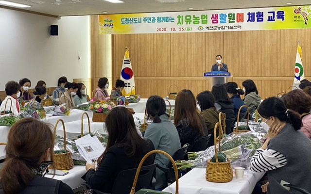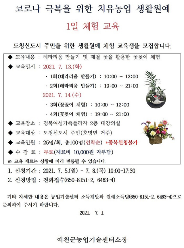 예천군농업기술센터(소장 성백경)는 7월 13일부터 14일까지 경북도청 신도시 주민 100명을 대상으로 경북여성가족플라자에서 치유농업 생활원예 체험 교육을 한다.