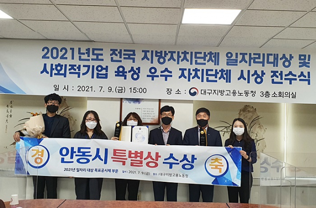 안동시는 9일 대구지방고용노동청에서 열린 고용노동부 주관‘2021년 전국 지방자치단체 일자리대상’표창장 전수식에서 2020년 실적 평가결과 지역일자리목표 공시제 부문 특별상을 수상해 기관표창과 5500만 원의 재정지원 인센티브를 받았다고 밝혔다.