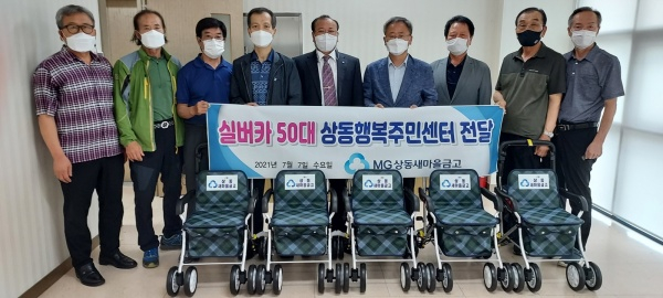| ↑↑ 상동새마을금고는 지난 7일 새마을금고 문화센터 2층에서 보행이 불편한 어르신들을 위해 실버카 50대(500만 원 상당)를 상동행정복지센터에 전달했다.(가운데 이동희 상동새마을금고 이사장) |