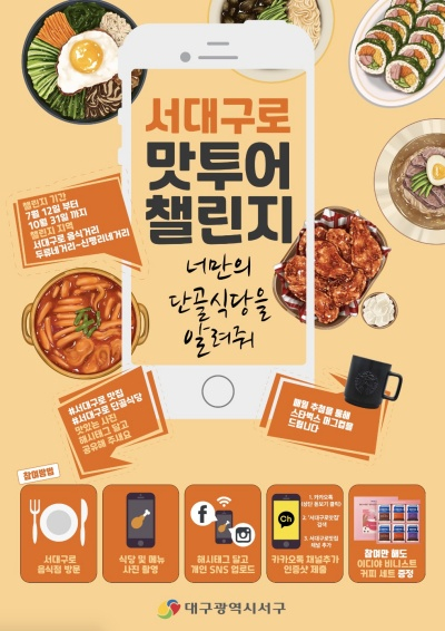 대구 서구청(구청장 류한국)은 서대구로 음식거리 집중홍보를 위해 7월12일부터 10월까지 「서대구로 맛투어 챌린지 ‘너만의 단골식당을 알려줘!’ 이벤트」를 진행한다.
