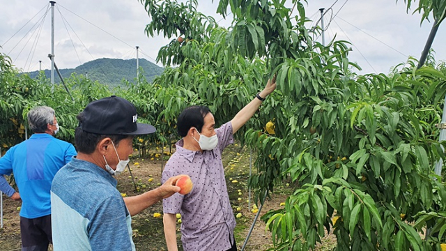 김주수 경북 의성군수는 7월 11일 우박 피해 현장을 방문해 직접 피해 상황을 점검하고 피해를 입은 농가를 위로했다.
