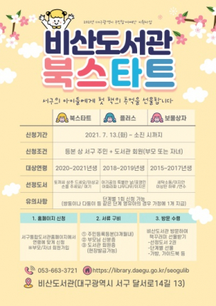 서구 비산도서관에서는 2021년 주민참여예산사업으로 선정되어 7월 13일부터 서구 거주 영·유아들에게 북꾸러미를 선물하는 「북스타트 사업」을 운영한다.