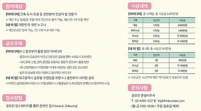 이번 공모전은 팔공산과 금호강의 자연조건을 담은 글로벌 문화수변도시 조성 아이디어, 4차 산업혁명과 디지털전환 시대에 부합하는 미래도시 조성 개념 등 K-2 종전부지 활용 ①국제아이디어 공모와 K-2 종전부지 글로벌 브랜딩을 위한 ②네이밍 공모로 진행된다.