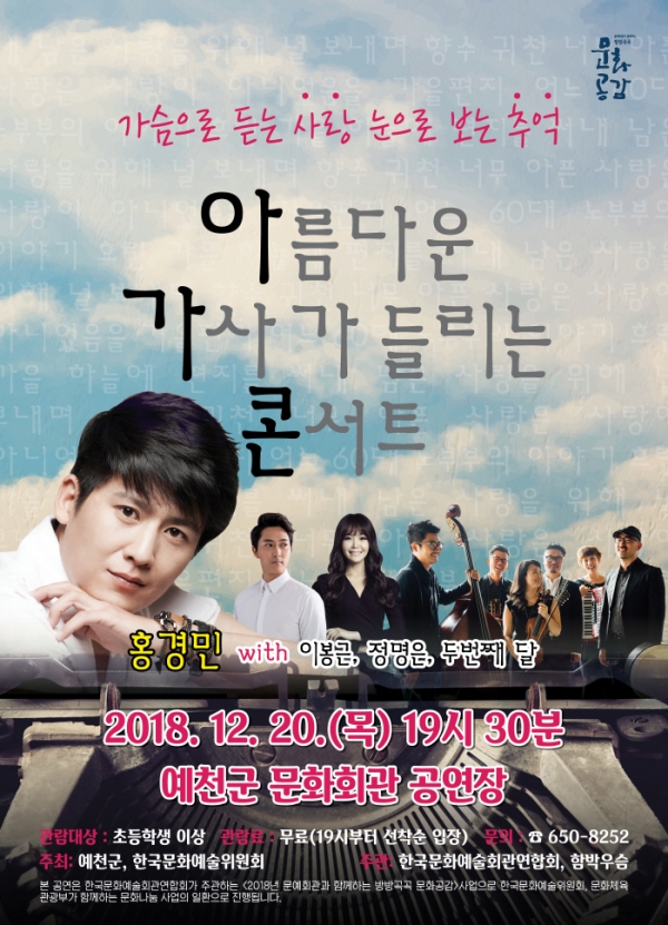 예천군(군수 김학동)은 오는 20일(목) 오후 7시 30분 문화회관에서 '아름다운 가사가 들리는 콘서트'를 개최한다.
