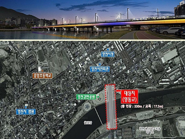 영동교 야간경관 개선사업은 총 사업비 11억원 전액 시비로 영동교 교량 양측 총 660m에 미디어파사드 연출, 교량 상부 보행자 스텝등, 수목 투광등, 교량 하부 천정 경관조명 설치 등을 통해 영천시를 가로지르는 금호강 위 영동교에 아름다운 야간 경관을 조성한다.