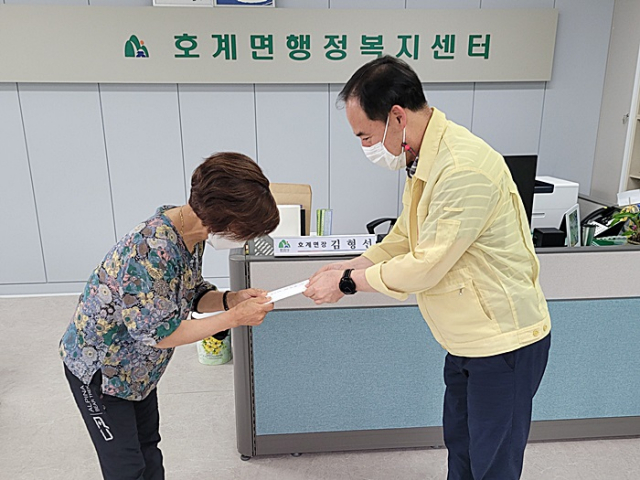 호계면(면장 김형선)은 7월 15일 면장실에서 악성골육종으로 희귀병 진단을 받은 한가연 학생의 조모인 정춘희(호계면 생활개선회장)에게 호계면 단체 및 직원들이 모은 성금 230만원을 전달했다.
