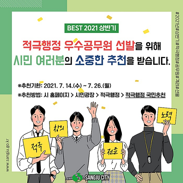 상주시(시장 강영석)는 적극행정을 장려하고 시민에게 무한 봉사하는 공직문화 조성을 위해 2021년 상반기 적극행정 우수 공무원을 선발한다고 지난 14일에 밝혔다. 선발 인원은 최우수 1, 우수 2, 장려 3 등 총 6명이다.