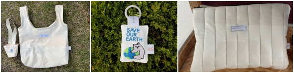 | ↑↑ 왼쪽부터 에코백&드링크백 세트, 투명페트병 재생솜으로 만든 키링, 다용도 파우치 |
