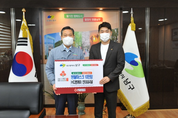 대구광역시 남구청(구청장 조재구)은 지난 20일, ㈜디엔케이 인터내셔널(대표 김경석)에서 어려운 이웃을 위해 덴탈마스크 10만 장(2,000만 원 상당)을 전달했다고 밝혔다.