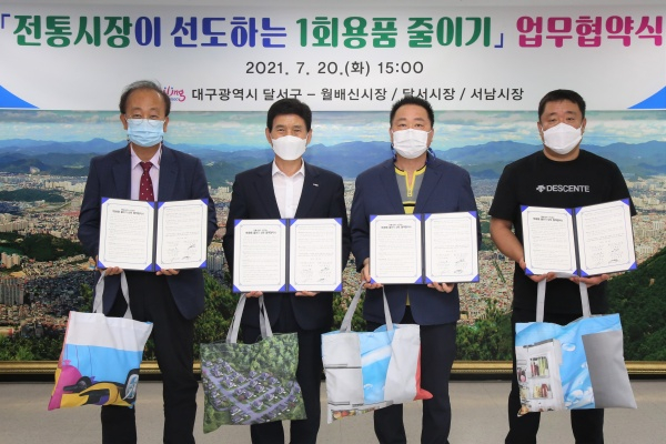대구 달서구(구청장 이태훈)는 20일 구청 5층 회의실에서 전통시장 상인회 3곳(월배신시장, 달서시장, 서남시장)과 일회용품 사용을 줄이고 환경보전을 위해 ‘전통시장이 선도하는 1회용품 줄이기’ 실천 상호 협약을 체결하였다고 밝혔다.