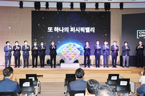 죽도시장 방역점검 후 김부겸 총리와 이강덕 시장은 여객선터미널로 이동하여 방역상황을 살펴보고 체인지업그라운드(CHANGeUP GROUND)준공식에 참석하였다.