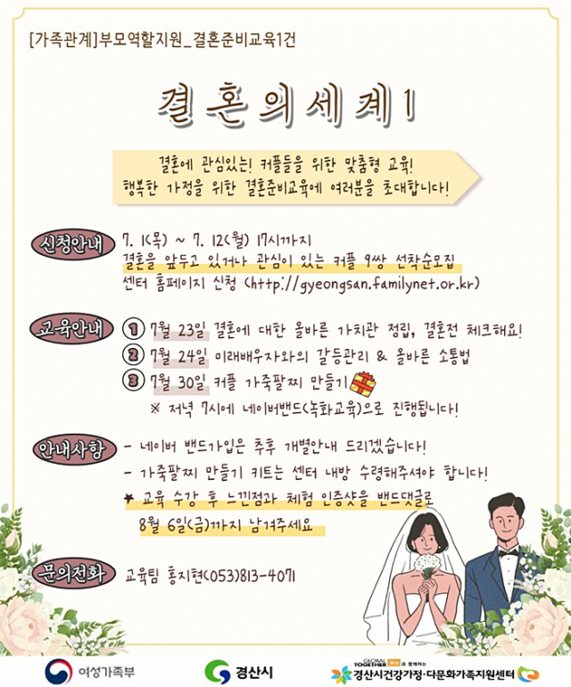 정영주 여성가족과장은 “결혼 준비교육을 통해 결혼생활에서 겪는 어려움과 문제를 원만히 해결할 수 있기를 바라며, 센터에서 건강한 가정, 행복한 부부가 될 수 있는 다양한 프로그램을 시행하여 많은 예비 부부들이 수강할 수 있기를 바란다”라고 전했다.