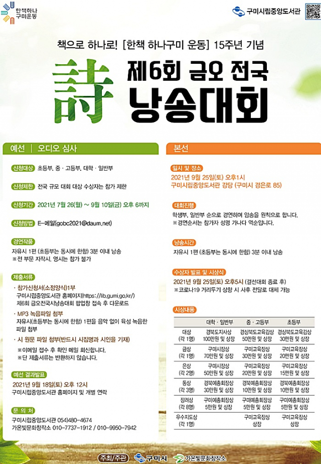 범시민 독서운동인 『한책하나구미운동』15주년을 기념하고 시낭송을 통한 인문학 정서 함양을 위해 개최되는 이번 행사는 초등부, 중ㆍ고등부, 대학ㆍ일반부 3개 부문으로 진행되며 초등학생 이상 전 국민 누구나 참여 가능하다.