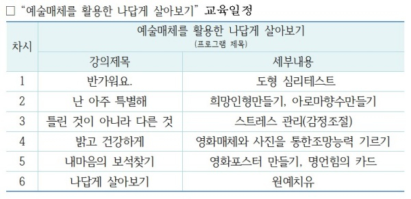 ‘예술매체를 활용한 나답게 살기’ 과정은 청장년 중 취약계층을 대상으로 원예치료, 아로마치료 등 예술매체를 매개로 하는 마음치유 교육이다.