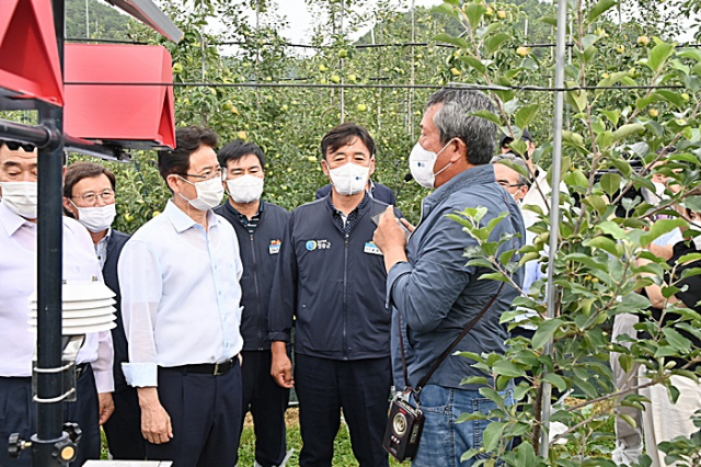 이어서 윤경희 청송군수는 주왕산면 지리에 위치한 사과농가를 방문해 자동 관수·관비시설과 IT페로몬트랩, 환경센서장비 등을 갖춘 스마트팜 시스템 견학을 안내하며, 열악한 농촌의 미래를 위해 향후 스마트팜 사업의 필요성에 대해 설명했다.