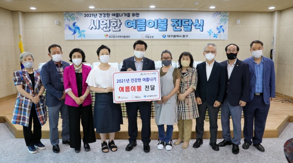 대구 중구청(구청장 류규하)은 남산종합사회복지관(관장신상윤)에서 지난 22일「건강한 여름나기 이불 전달식」을 진행하고 저소득 어르신에게 여름이불 24채(100만 원 상당)를 지원했다.