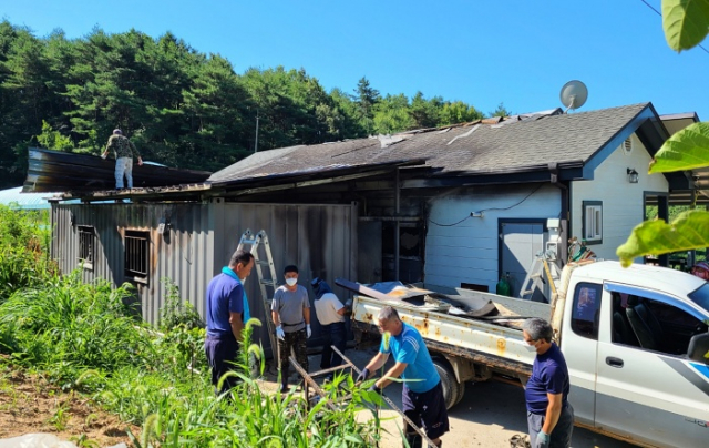봉화군 명호면 도천3리 마을회가 지난 7월 27일(화) 이른 새벽부터 지난 7월 15일 낙뢰로 인한 화재에 주택이 전소되어 보금자리를 잃은 피해 가구 집 철거와 현장 정리를 위해 구슬땀을 흘렸다.