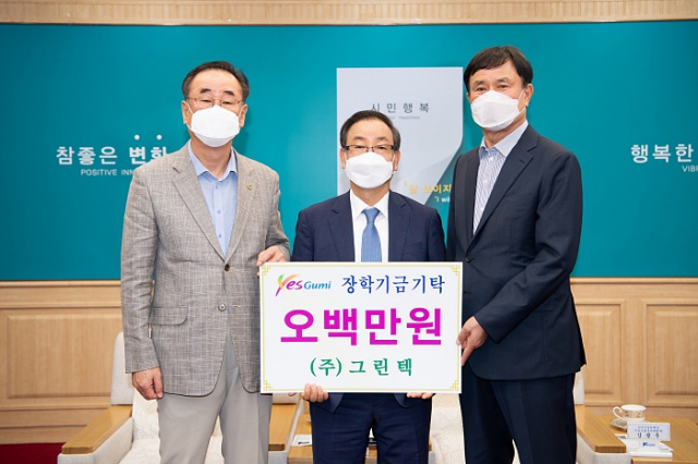 (재)구미시장학재단(이사장 장세용)은 7.29.(목) 10시 시청 국제통상협력실에서 (주)그린텍(대표이정곤)으로부터 장학기금(500만원)을 기탁받는 뜻깊은 자리를 가졌다.