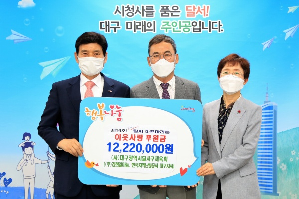 | ↑↑ '2020년 달서 하프마라톤 대회' 이웃사랑 후원금 전달 사진 |