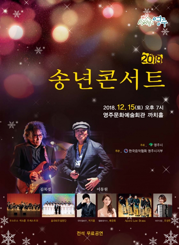 경북 영주시(시장 장욱현) 는 오는 15일 오후 7시 영주문화예술회관 까치홀에서 블루스의 거장 김목경, 시를 노래하는 가수 이동원 등과 함께하는 ‘2018 송년 콘서트’를 개최한다.